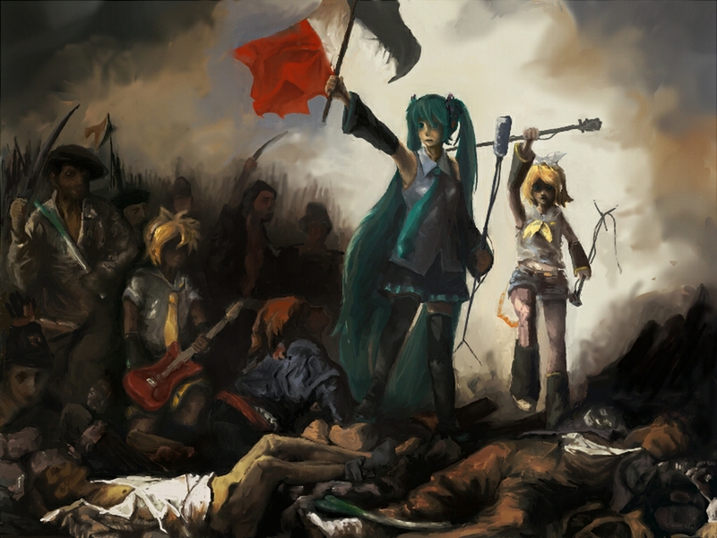 Una mujer personifica el concepto y la diosa de la libertad conduce a la gente hacia los cuerpos de los caídos, que sostiene la bandera de la Revolución Francesa.